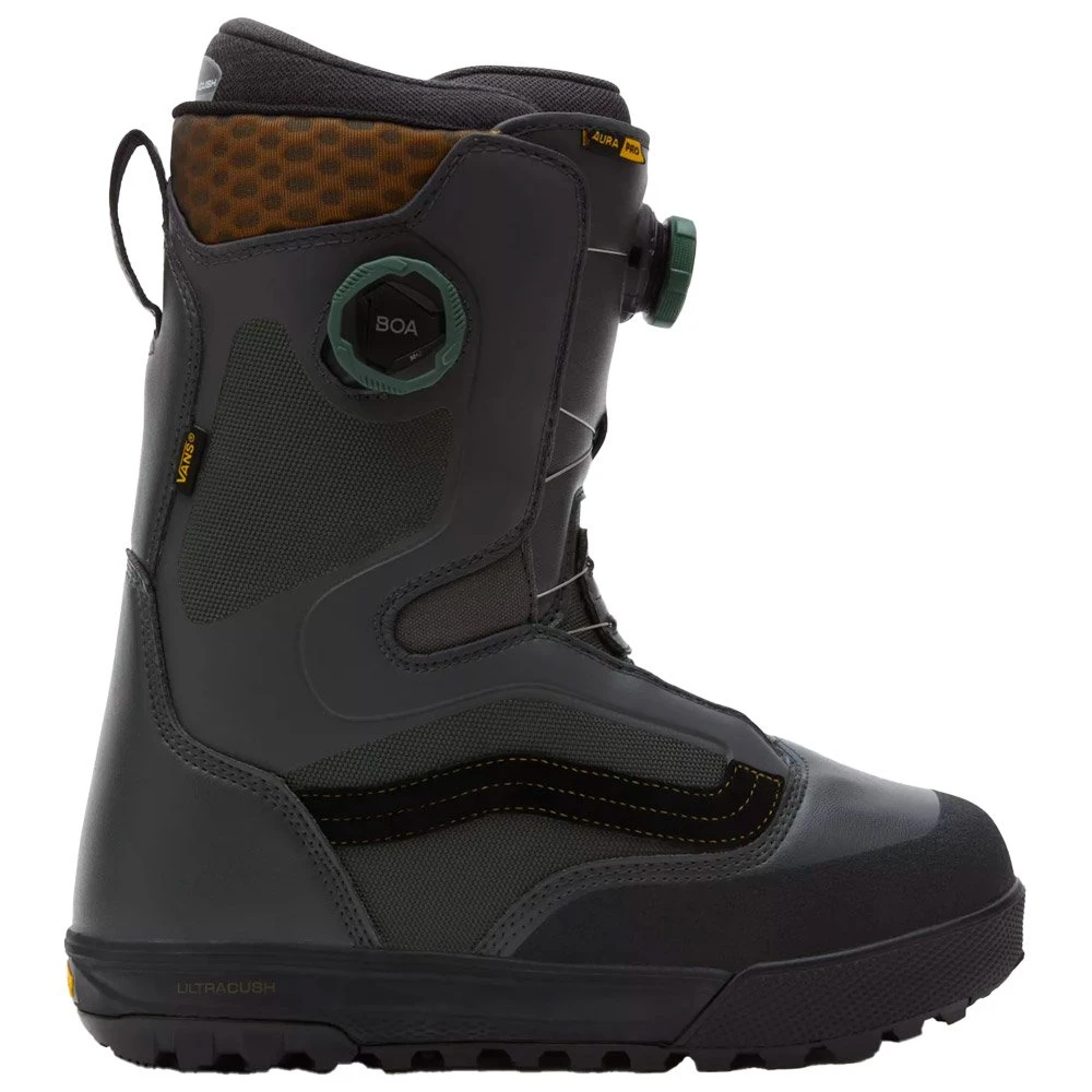 La Vans Aura Pro está diseñada para adaptarse a todos los terrenos. Su rigidez intermedia ofrece un buen compromiso entre flexibilidad y capacidad de respuesta, permitiendo tanto precisión en los giros como comodidad para largas jornadas de conducción. El sistema de ajuste Double Boa permite un ajuste rápido y preciso, para un rendimiento óptimo en todas las condiciones. El forro UltraCush™ Smartwool® V2 y su suela Waffle Pro V2 prometen una gran comodidad, mientras que el talón Custom Glide Guide ofrece una buena sujeción del talón.